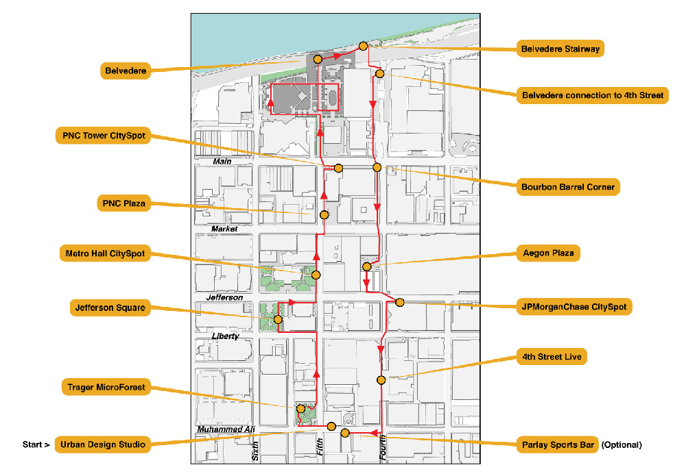 We began at the UofL Urban Design Studio at 5th and Muhammad Ali Boulevard, headed north to the Belvedere overlooking the Ohio River, then returned south along 4th Street, stopping at key public spaces along the way.