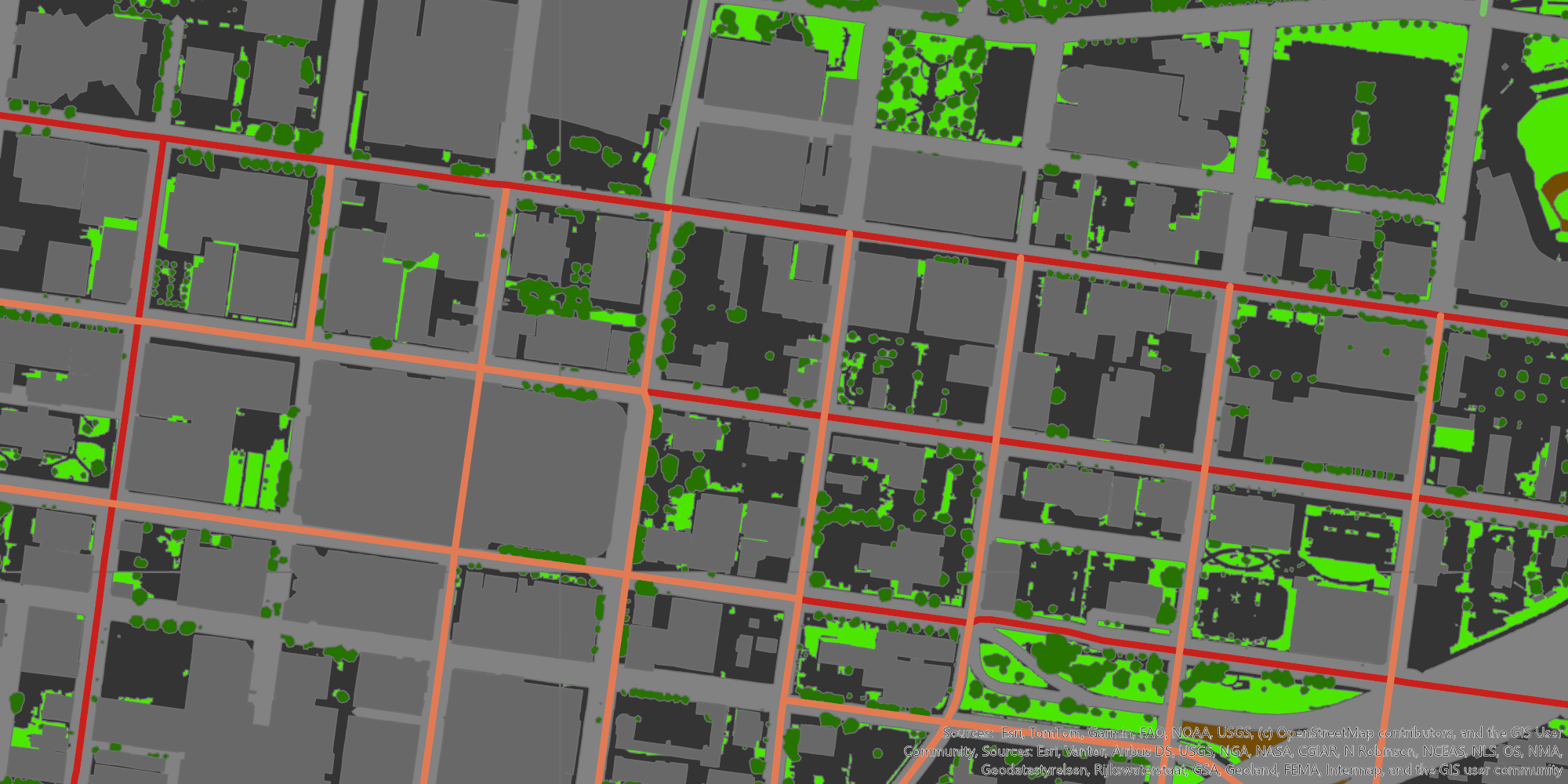 This cutting takes the total roadways from 1,001 to 257. Using this final road dataset, we can assess the land cover that makes up the 200-ft area around each road (this catches roads and usually one single-family home sized lot adjacent to them). All impervious surfaces and buildings were thrown together into one percentage value, which gives the “gray”ness value for each roadway. The same methodology can be done with tree canopy coverage as well, so you can also see which corridors are the most green. The web app below shows a map of the grayest corridors, a ranking of each corridor by grayness, and some other relevant information.