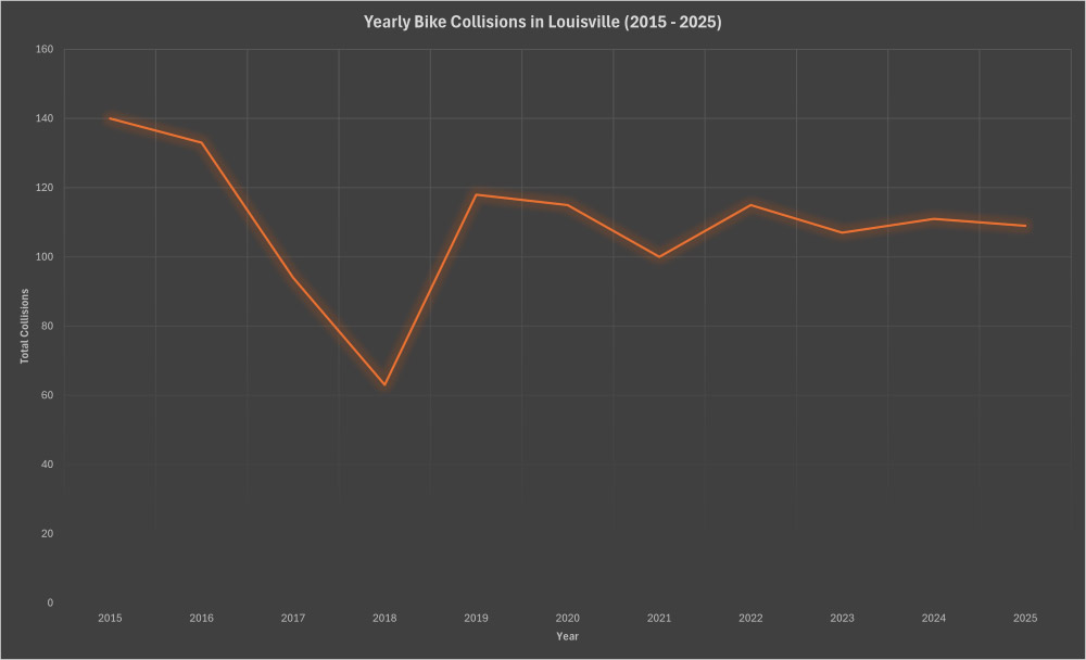 Louisville has seen substantial improvements in bike infrastructure over the past couple years, but cycling safety outcomes have remained relatively stagnant. The infrastructure improvements have largely been concentrated in Louisville’s eastern urban neighborhoods, while roadways that have seen many collisions every year (Dixie Highway, Broadway, Preston) have not seen any improvements or creation of adjacent bicycle routes. There are long term changes down the pipeline that will improve things, such as the previously mentioned Broadway all the Way, but smaller scale projects that would have smaller timeframes seem to have fizzled out for 2026. Despite that, there are a litany of cheap solutions available for Louisville to utilize that would make cycling safer, such as parking-protected bike lanes, bike boxes, and two-way conversions.